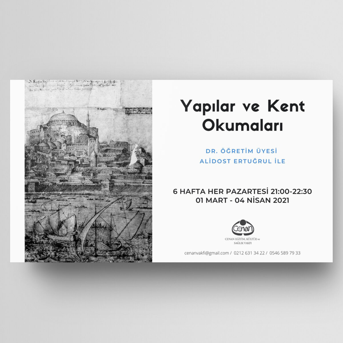 Bursa Teknik Üniversitesi Mimarlık Fakültesi Öğretim Üyesi Dr.Alidost ERTUĞRUL ile “YAPILAR VE KENT OKUMALARI ATÖLYESİ” 8 Mart 2021 Pazartesi günü saat 21.00’de başlayacaktır. Dersler Zoom üzerinden çevrimiçi olarak ve 6 hafta süreyle, haftada 1.5 saat olacak şekilde yapılacaktır. Katılımcı sayısı 20 kişi ile sınırlıdır. Detaylı bilgi almak ve kayıt yaptırmak için cenanvakfi@gmail.com adresine mail atabilir ya da 0212 631 34 22, 0546 589 79 33 numaralı telefonlardan Vakfımızla iletişime geçebilirsiniz.