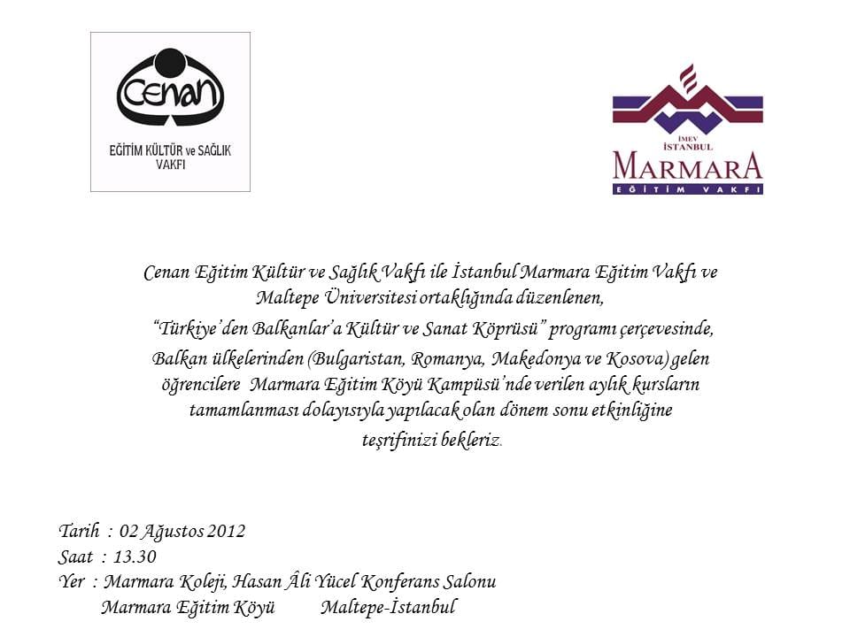 Kosova, Makedonya, Bulgaristan ve Romanya’dan 12-18 yaşları arasındaki 28 öğrenciye 08 Temmuz – 05 Ağustos 2012 tarihleri arasında kültür ve sanat eğitimi verilmiştir. Eğitimi takiben dönem sonu etkinliği ile katılım sertifikaları verilmiştir.
