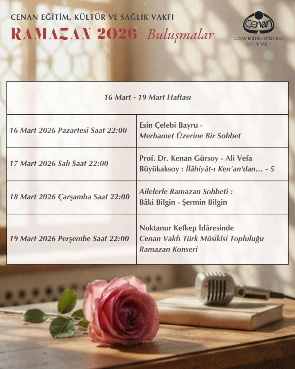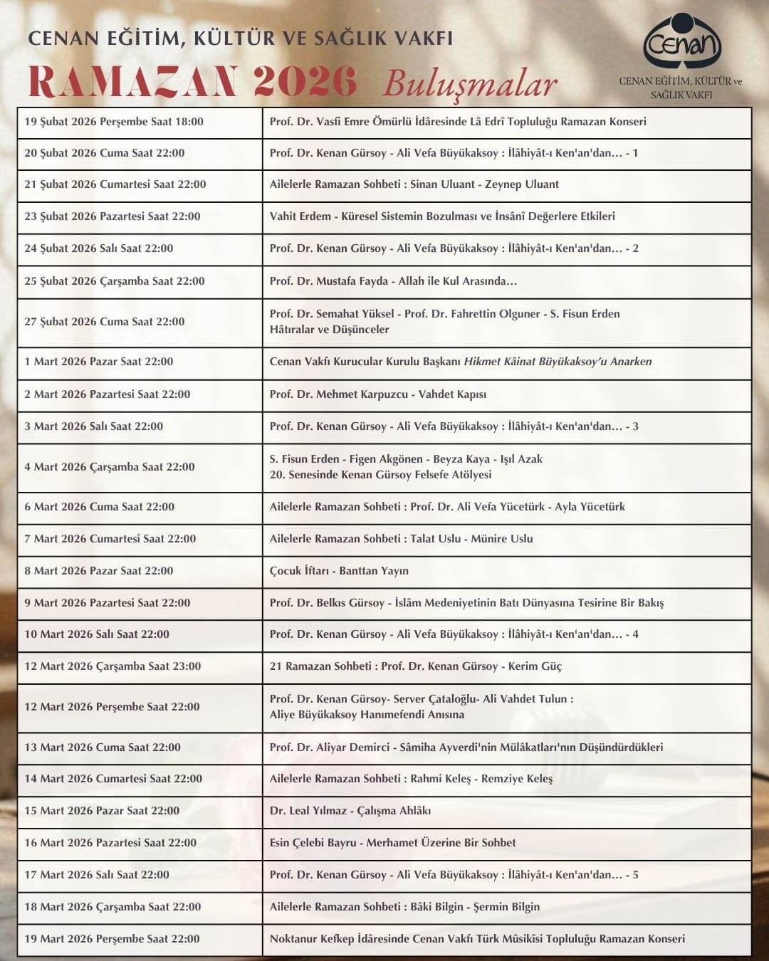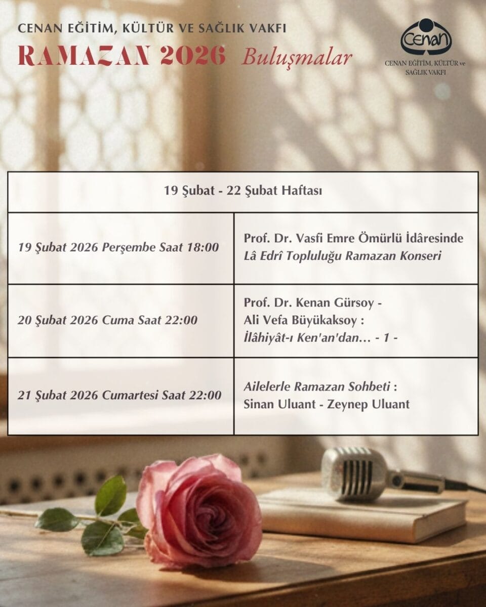 Cenan Eğitim, Kültür ve Sağlık Vakfı olarak Ramazan ayı boyunca devam edecek çevrimiçi konuşma, sohbet ve konser programları tertip etmiş bulunmaktayız. 19 Şubat Perşembe günü saat 18.00’den itibaren başlayacak olan programlarımız Cenan Vakfı YouTube kanalı üzerinden yayınlanacaktır. Siz değerli dostlarımızla sağlıkla bir arada olmayı diler, Ramazan ayının hayırlı ve bereketli olmasını niyaz ederiz.