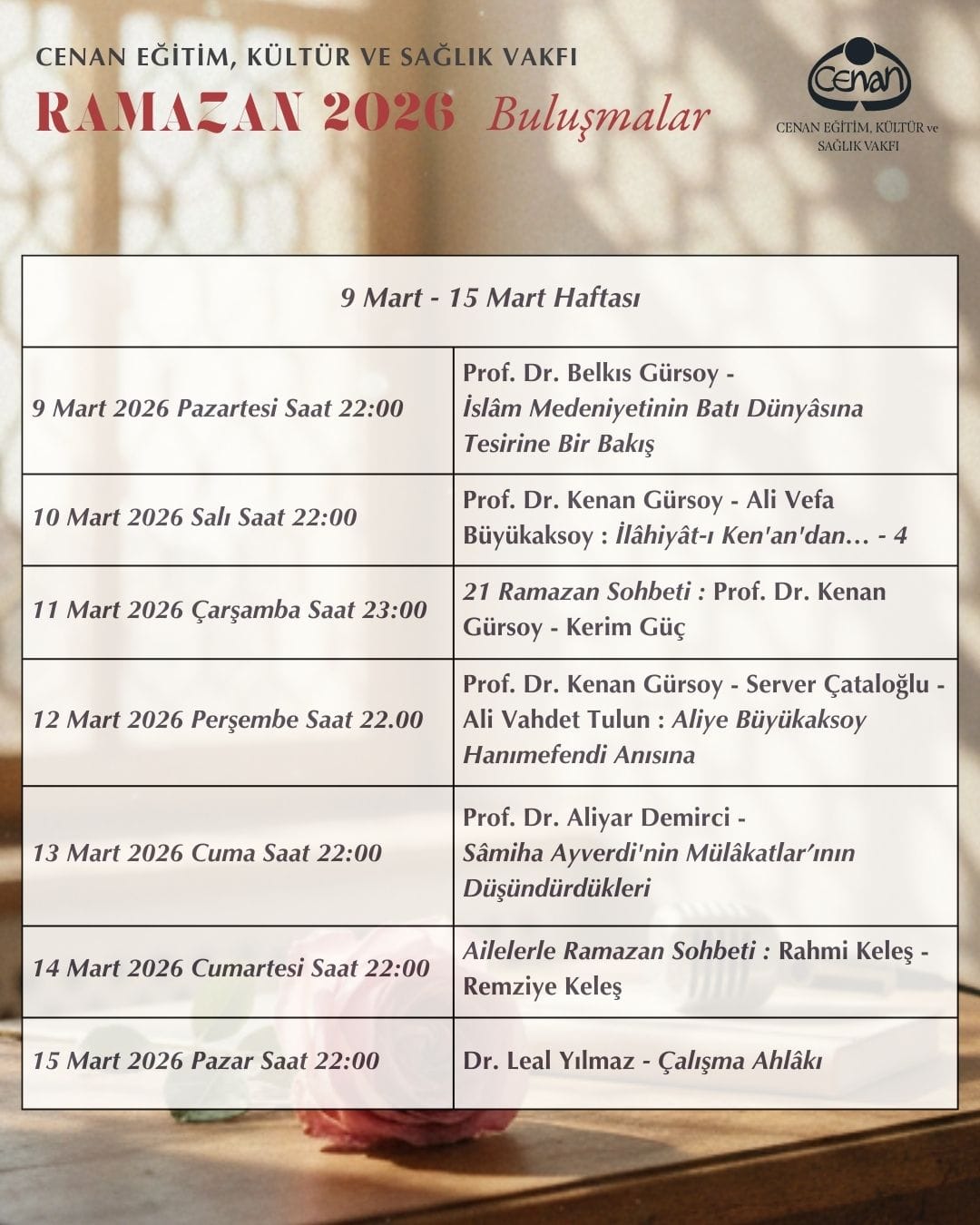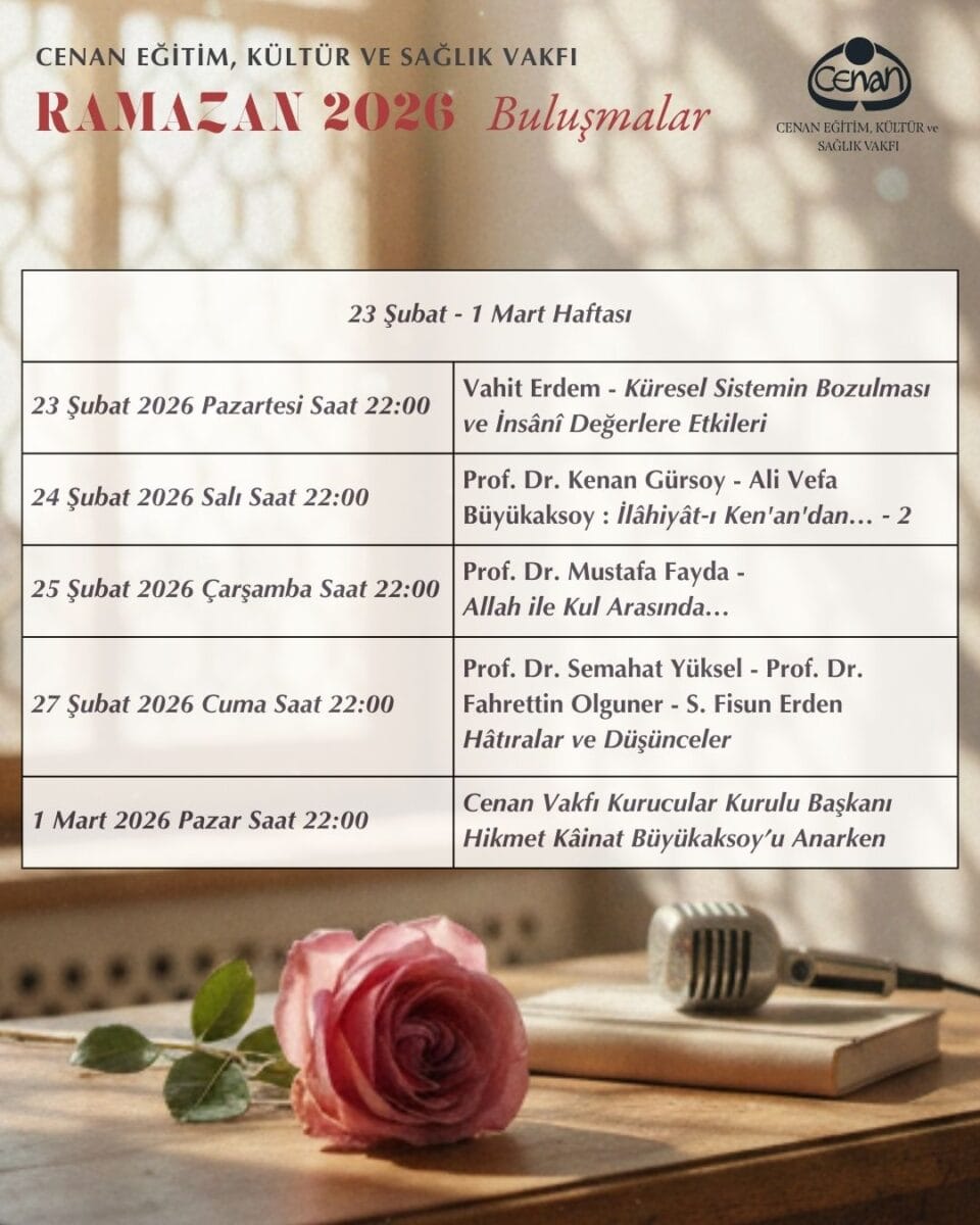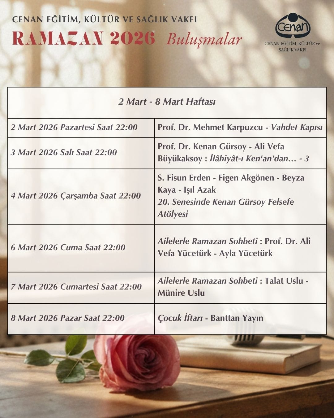 Cenan Eğitim, Kültür ve Sağlık Vakfı olarak Ramazan ayı boyunca devam edecek çevrimiçi konuşma, sohbet ve konser programları tertip etmiş bulunmaktayız. 19 Şubat Perşembe günü saat 18.00’den itibaren başlayacak olan programlarımız Cenan Vakfı YouTube kanalı üzerinden yayınlanacaktır. Siz değerli dostlarımızla sağlıkla bir arada olmayı diler, Ramazan ayının hayırlı ve bereketli olmasını niyaz ederiz.