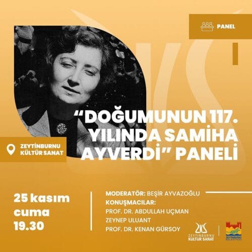 “Doğumunun 117. Yılında Sâmiha Ayverdi” paneli Cenan Vakfı Mütevelli Heyet ve Yönetim Kurulu Başkanı Prof.Dr.Kenan Gürsoy’un katılımıyla 25 Kasım Cuma saat 19:30’da Zeytinburnu Kültür ve Sanat merkezinde gerçekleşecektir.