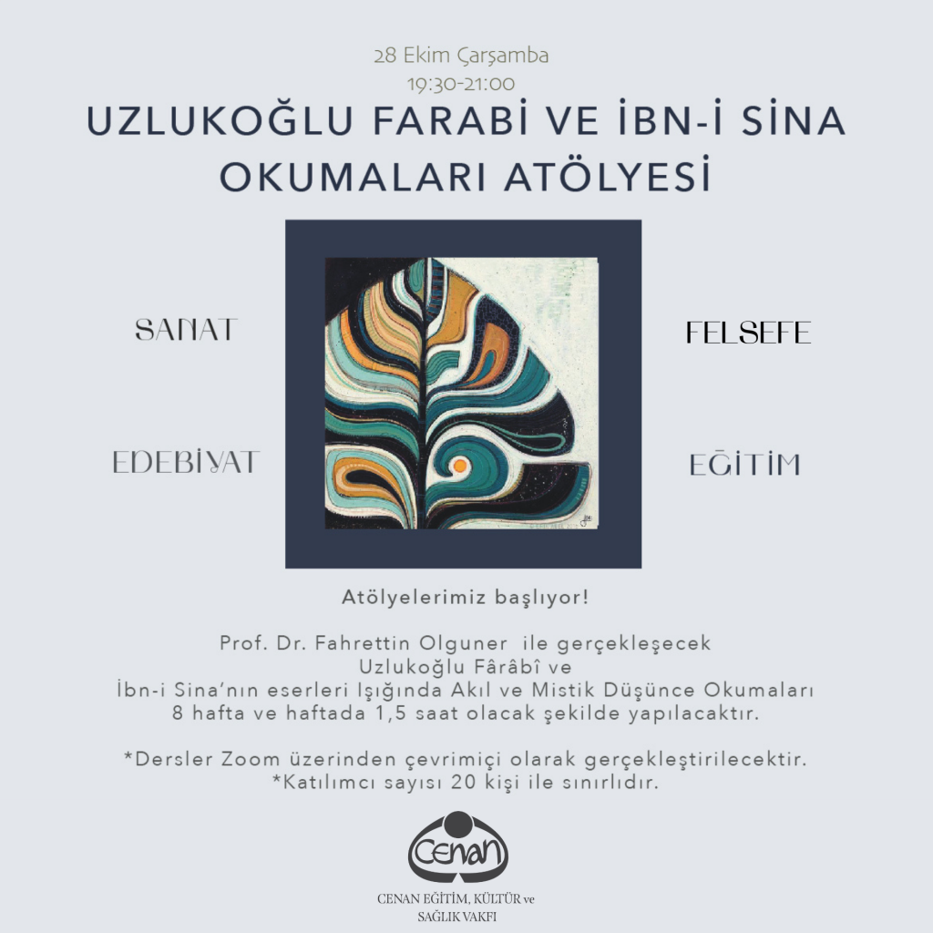 Marmara Üniversitesi İlâhiyat Fakültesi Türk İslâm Düşüncesi Tarihi Bilim Dalı Emekli Öğretim Üyesi Prof. Dr. Fahrettin Olguner ile düşüncenin genişlemesine, derinleşmesine ve ‘varoluş kavramının’ anlaşılmasına yardımcı olmak amacıyla, “Uzlukoğlu Fârâbî ve İbn-i Sina’nın Eserleri Işığında Akıl ve Mistik Düşünce Okumaları” atölyesi 28 Ekim 2020 Çarşamba günü saat 19.30’da başlayacaktır.