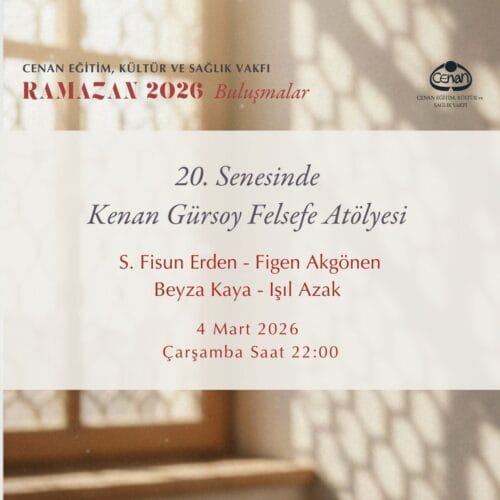Vakfımız tarafından düzenlenen, Ramazan ayı boyunca devam edecek çevrimiçi buluşmalarımızda bugün saat 22.00’de, S.Fisun Erden, Figen Akgönen, Beyza Kaya ve Işıl Azak “20. Senesinde Kenan Gürsoy Felsefe Atölyesi” konulu konuşmalarıyla bizlerle bir arada olacaklardır.