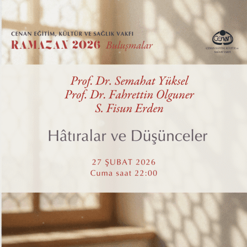 Vakfımız tarafından düzenlenen, Ramazan ayı boyunca devam edecek çevrimiçi buluşmalarımızda bugün saat 22.00’de, Prof. Dr. Semahat Yüksel, Prof. Dr. Fahrettin Olguner ve S.Fisun Erden “Hâtıralar ve Düşünceler” konulu konuşmalarıyla bizlerle bir arada olacaklardır.