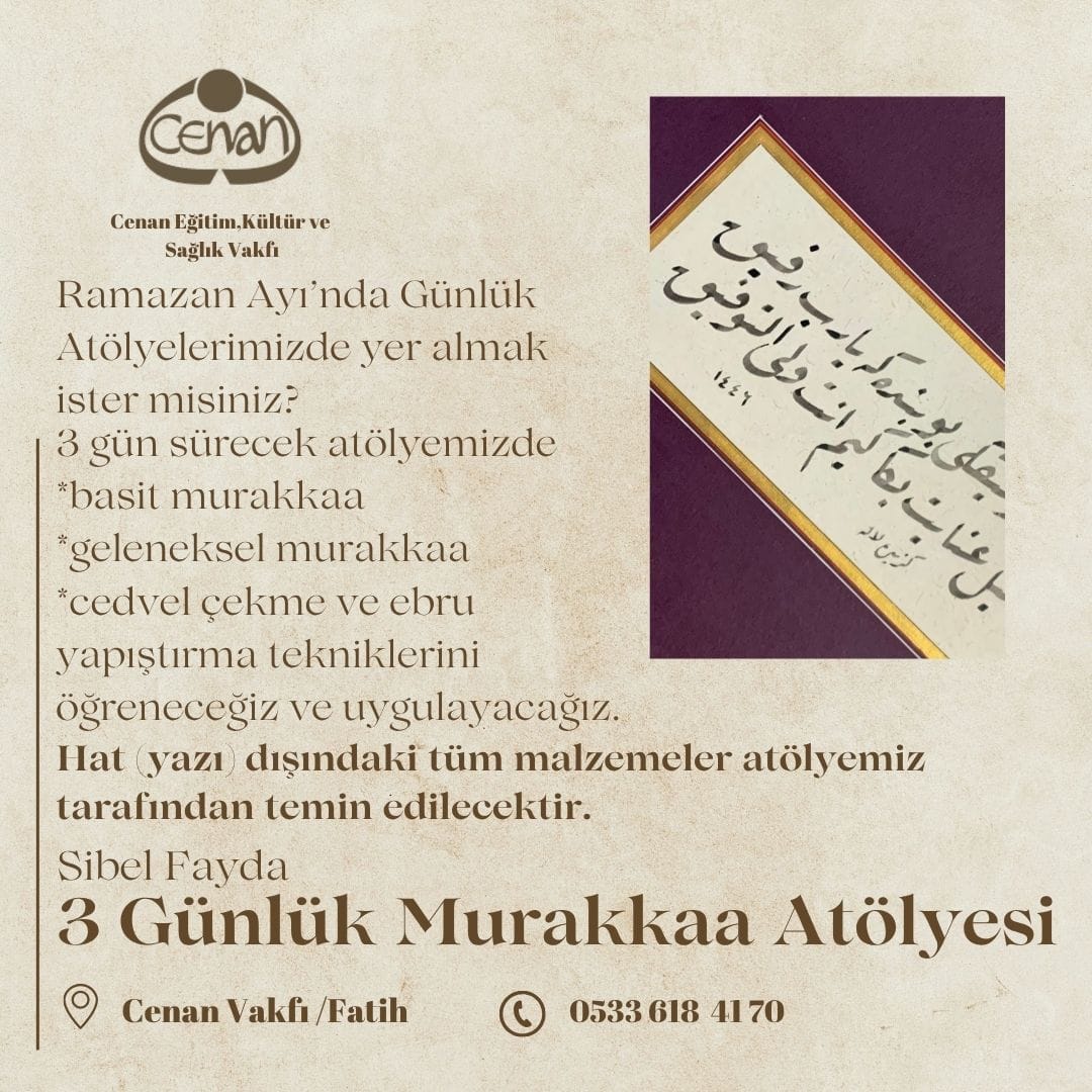 Cenan Vakfı Sanat Atölyesi’nde Ramazan Ayı boyunca günlük atölyeler düzenlenmiştir. Sibel Fayda yürütücülüğünde 3 gün sürecek olan “Murakkaa Atölyesi”nin ilki 17 Mart 2025 Pazartesi günü başlayacaktır.