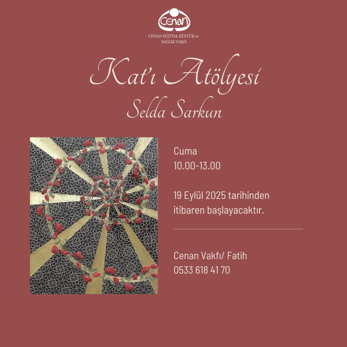 Cenan Vakfı Sanat Atölyesi 2025-2026 eğitim programları kapsamında Selda Sarkun yürütücülüğünde ‘Kat’ı Atölyesi’ 19 Eylül 2025 tarihinden itibaren başlayacaktır. Derslerimiz haftada bir gün, ayda dört ders olmak üzere aylık olarak ilerleyecektir.