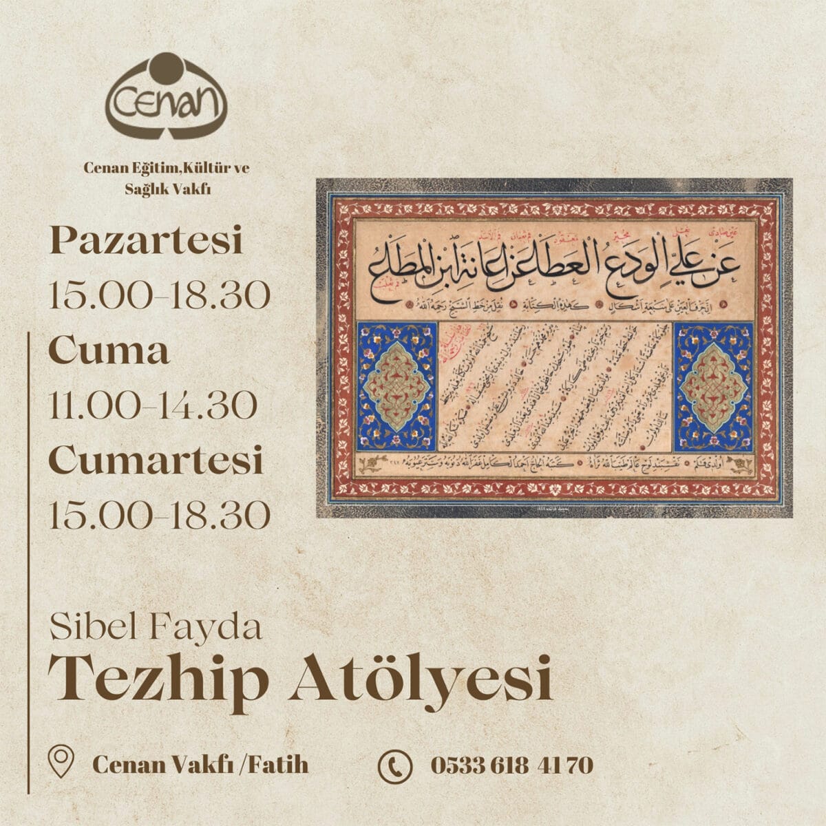 Cenan Vakfı Sanat Atölyesi 2024-2025 eğitim programları kapsamında Sibel Fayda yürütücülüğünde ‘Tezhip Atölyesi’ 7 Nisan Pazartesi gününden itibaren başlayacaktır. Derslerimiz haftada bir gün, ayda dört ders olmak üzere aylık olarak ilerleyecektir.