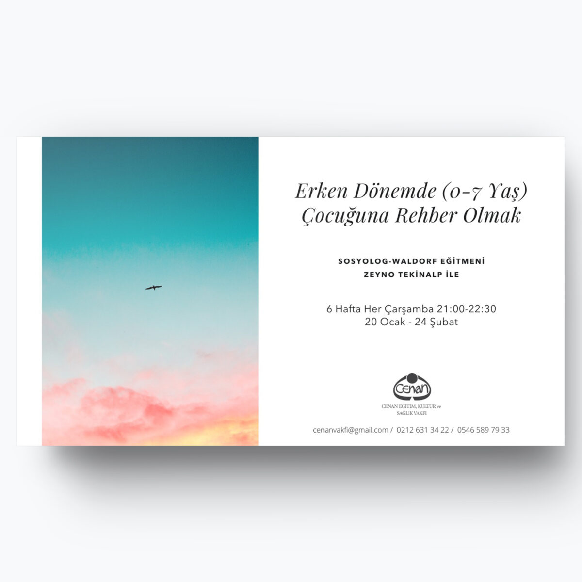 Waldorf Pedagojisinden esinlen Sosyolog, Felsefeci Zeyno Tekinalp ile “Erken Dönemde (0-7 yaş) Çocuğuna Rehber Olmak Atölyesi” 20 Ocak 2021 Çarşmaba günü saat 21.00’de başlayacaktır. Dersler Zoom üzerinden çevrimiçi olarak gerçekleştirilecek ve 6 hafta süreyle, haftada 1.5 saat olacak şekilde yapılacaktır. Katılımcı sayısı 20 kişi ile sınırlıdır. Detaylı bilgi almak ve kayıt yaptırmak için cenanvakfi@gmail.com adresine mail atabilir ya da 0212 631 34 22 ve 0546 589 79 33 numaralı telefonlardan Vakfımızla iletişime geçebilirsiniz.