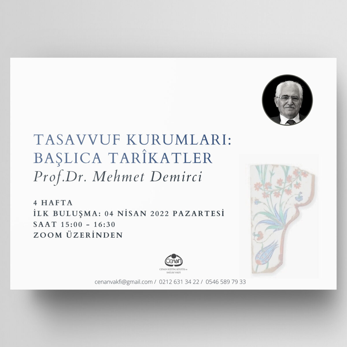 Prof. Dr. Mehmet Demirci ile “Tasavvuf Kurumları: Başlıca Tarîkatler ” konulu atölyemiz 4 Nisan 2022 Pazartesi günü saat 15.00’te başlayacaktır.