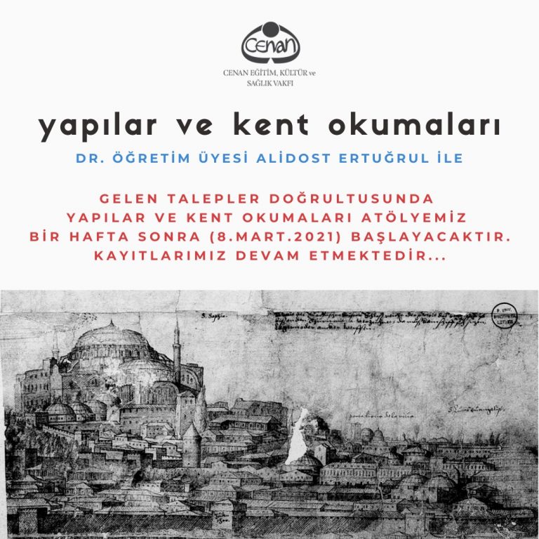 Bursa Teknik Üniversitesi Mimarlık Fakültesi Öğretim Üyesi Dr.Alidost ERTUĞRUL ile “YAPILAR VE KENT OKUMALARI ATÖLYESİ” 8 Mart 2021 Pazartesi günü saat 21.00’de başlayacaktır. Dersler Zoom üzerinden çevrimiçi olarak ve 6 hafta süreyle, haftada 1.5 saat olacak şekilde yapılacaktır. Katılımcı sayısı 20 kişi ile sınırlıdır. Detaylı bilgi almak ve kayıt yaptırmak için cenanvakfi@gmail.com adresine mail atabilir ya da 0212 631 34 22, 0546 589 79 33 numaralı telefonlardan Vakfımızla iletişime geçebilirsiniz.