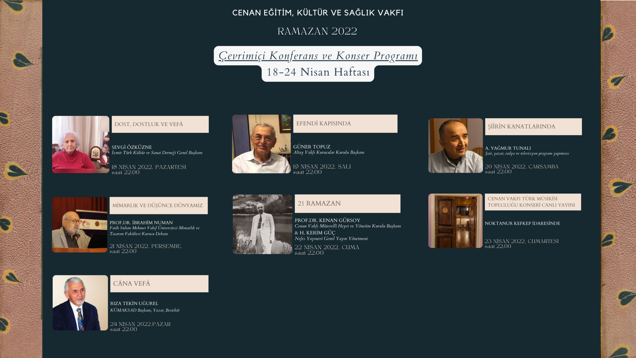 Cenan Eğitim, Kültür ve Sağlık Vakfı olarak düzenlediğimiz, Ramazan ayı boyunca devam edecek çevrimiçi konferans ve konser programlarımızın son haftalık bölümünü (25 Nisan-01 Mayıs 2022), siz değerli dostlarımızla paylaşıyoruz. Her akşam saat 22.00’de gerçekleştirilecek yayınımızı Cenan Vakfı Youtube kanalı üzerinden veya Vakfımızın sosyal mecralarında günlük olarak duyurulacak bağlantılar yoluyla takip edebilirsiniz. Ramazan ayının hayırlı olmasını ve sıhhatle programlarımızda buluşmayı dileriz.