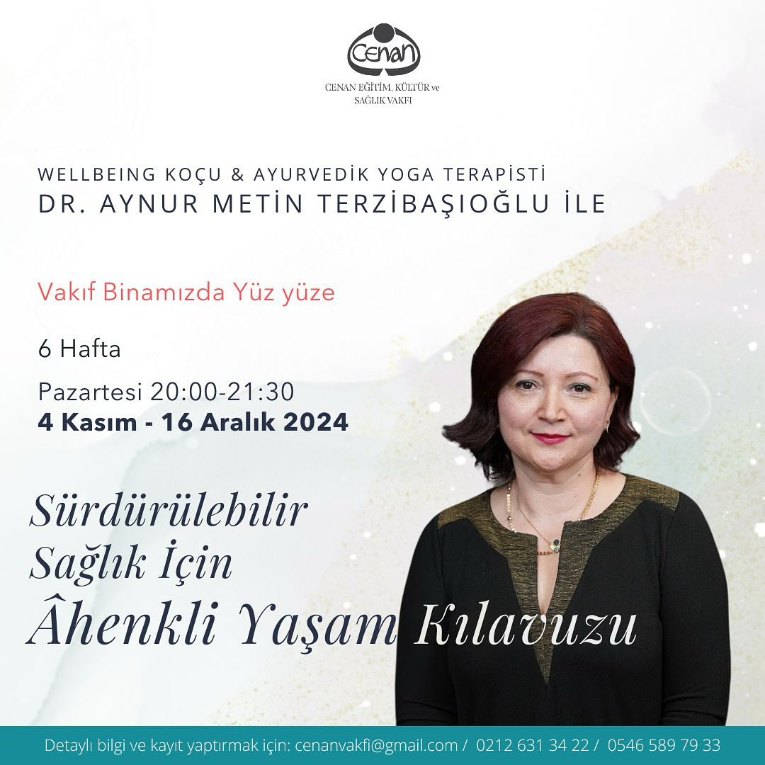 Cenan Eğitim, Kültür ve Sağlık Vakfı 2024-2025 eğitim programları kapsamında Wellbeing Koçu ve Ayurverdik Yoga Terapisti Dr. Aynur Metin Terzibaşıoğlu yürütücülüğünde “Sürdürülebilir Sağlık için Âhenkli Yaşam Kılavuzu” Atölyesi 4 Kasım 2024 Pazartesi günü başlayacaktır. Dersler 6 Hafta boyunca her Pazartesi 20:00-21:30 arası Vakıf binamızda yüz yüze yürütülecektir.