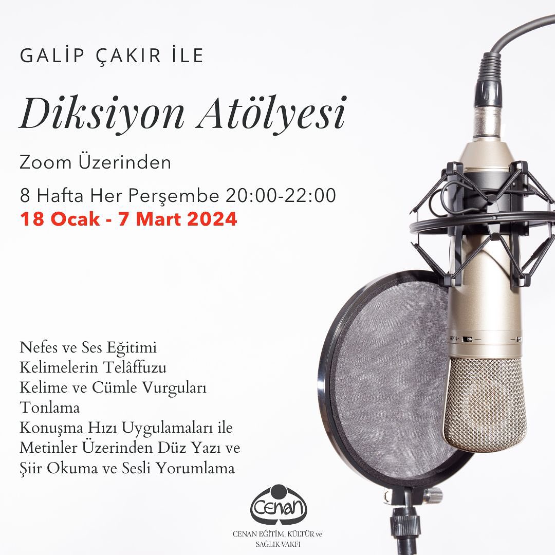 Galip Çakır ile “Diksiyon Atölyesi”, 18 Ocak 2024 Perşembe günü saat 20.00’da başlayacaktır. Dersler Zoom üzerinden çevrimiçi olarak, 8 hafta boyunca haftada 2 saat süreyle yapılacaktır. Derslerde; Nefes ve Ses Eğitimi, Kelimelerin Telâffuzu, Kelime ve Cümle Vurguları, Tonlama, Konuşma Hızı Uygulamaları ile Metinler Üzerinden Düz Yazı ve Şiir Okuma ve Sesli Yorumlama gibi konular işlenecektir. Başarılı olanlara Kurs Bitirme Belgesi verilecektir.