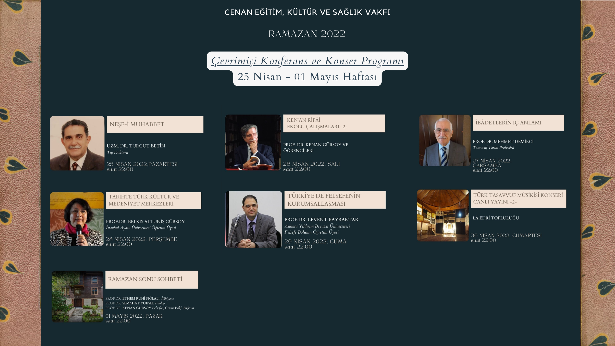 Cenan Eğitim, Kültür ve Sağlık Vakfı olarak Ramazan ayı boyunca devam edecek çevrimiçi konuşma,…