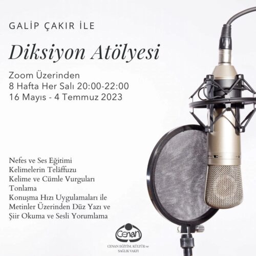 Galip Çakır ile “Diksiyon Atölyesi”, 16 Mayıs 2023 Salı günü saat 20.00’da başlayacaktır. Dersler…