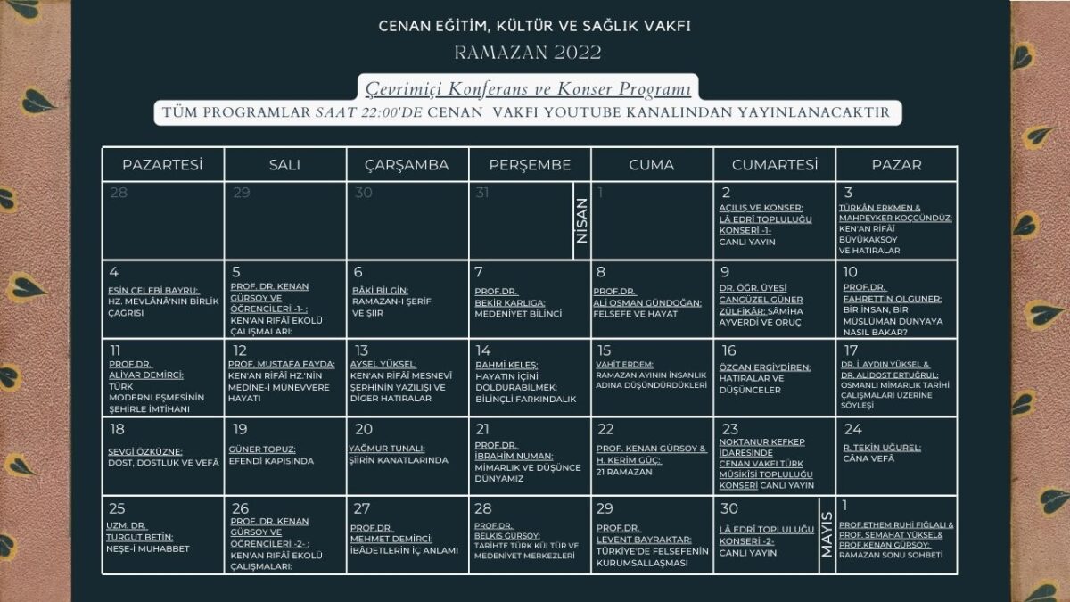 Cenan Eğitim, Kültür ve Sağlık Vakfı olarak Ramazan ayı boyunca devam edecek çevrimiçi konferans ve konser programları tertip etmiş bulunmaktayız. Cenan Vakfı Youtube kanalı üzerinden her akşam saat 22.00’de yayınlanacak programlarda siz değerli dostlarımızla sağlıkla bir arada olmayı diler, Ramazan ayının hayırlı ve bereketli olmasını niyaz ederiz.