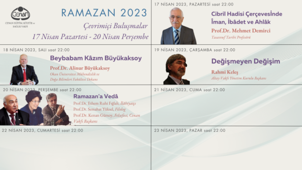 Cenan Eğitim, Kültür ve Sağlık Vakfı olarak Ramazan ayı boyunca devam edecek çevrimiçi konuşma, sohbet ve konser programları tertip etmiş bulunmaktayız. Cenan Vakfı Youtube kanalı üzerinden her akşam saat 22.00’de yayınlanacak programlarda siz değerli dostlarımızla sağlıkla bir arada olmayı diler, Ramazan ayının hayırlı ve bereketli olmasını niyaz ederiz.
